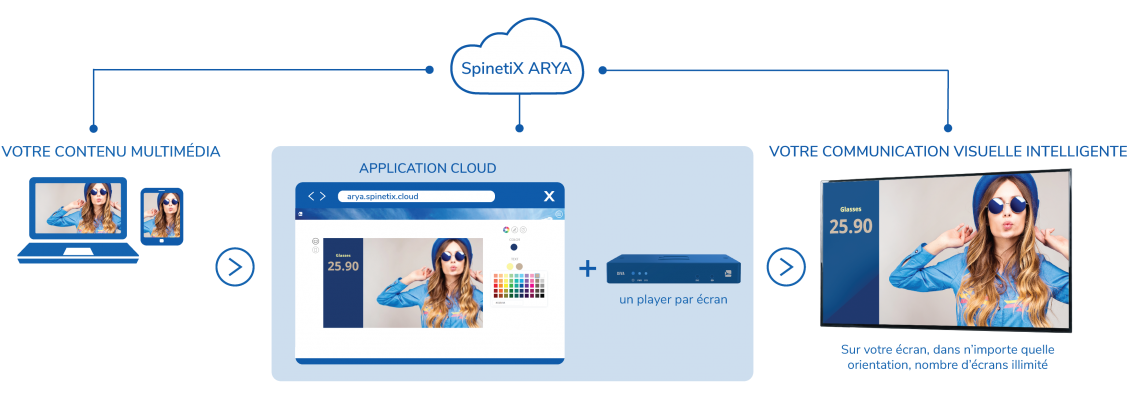 Avec SpinetiX ARYA, vous avez tous les outils en main pour bien démarrer. Téléchargez votre contenu multimédia à partir de vos appareils, définissez un nombre illimité d’écrans, placez un contenu unique et dédié sur chacun d’eux, à distance, et accédez au support en ligne en direct.